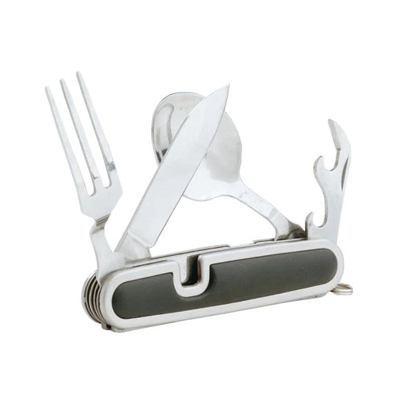 - Contains a fork, a spoon, a knife and a bottle-opener.
