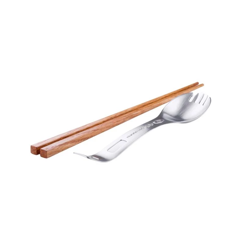 - Camp utensil that gives you the function of a spoon, fork and a set of chopsticks.