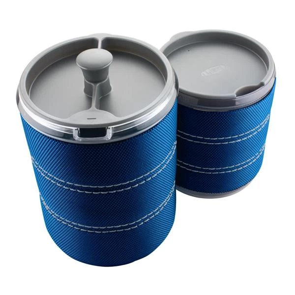 - Contains a press carafe and isolated mug both with lids.