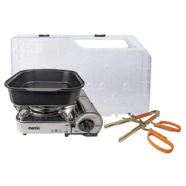 - Include: BTU 7 200 stove, a multifunction pan, pliers, cisors and a space for a butane bottle.