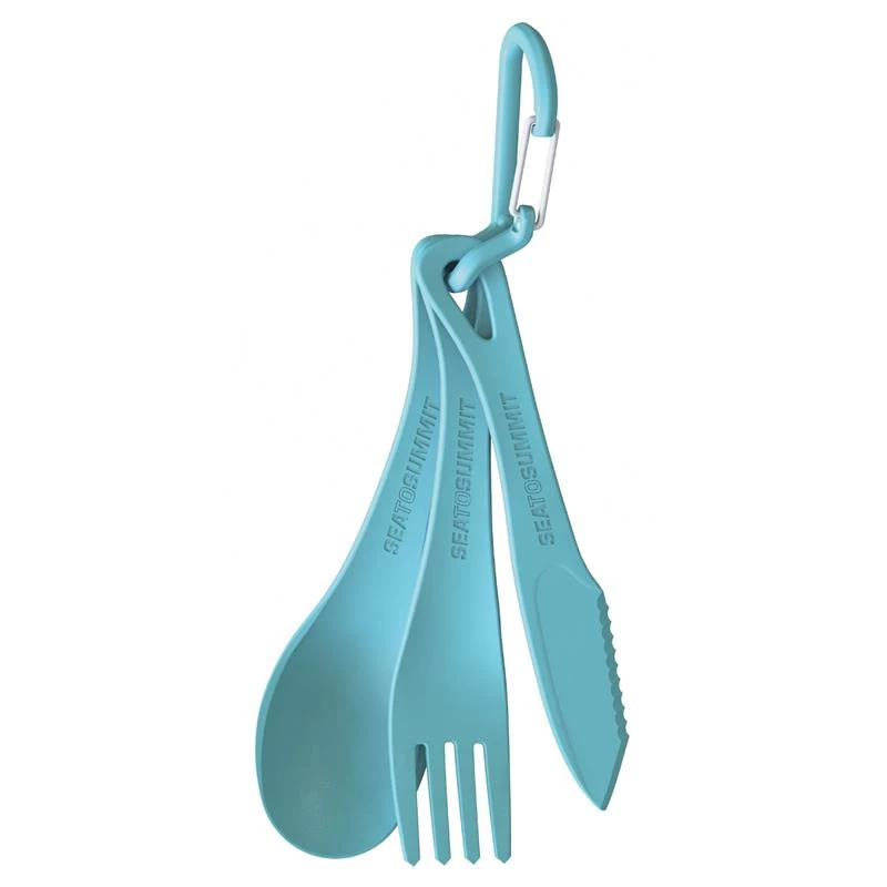 - Includes a spoon, a fork and a knife attached with a carabiner.
